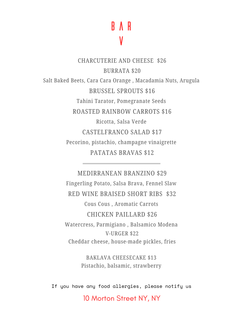 If you're looking for a spot in New York where you can relax and enjoy a great meal with friends, Bar V Menu has you covered. Nestled at 10 Morton St, New York, NY, this place offers a unique blend of flavors that’s sure to satisfy your cravings. Whether you’re here for a quick bite or a leisurely evening out, the menu caters to all kinds of tastes, with dishes that strike the perfect balance between comfort and sophistication.